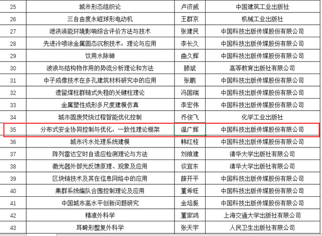 近期,国家科学技术学术著作出版基金委员会公布了2022年度国家科学技术学术著作出版基金资助项目。澳门巴黎人娱乐城 温广辉,付俊杰、吕跃祖、万颖四位老师依托科学出版社拟出版的学术著作“分布式安全协同控制与优化:一致性理论框架”获得资助,这是澳门巴黎人娱乐城 自2015年虞文武、温广辉、曹进德教授首次获得该国家级出版基金资助以来第2次获得资助。本次全国共有198部著作获得国家科学技术学术著作出版基金项目资助。