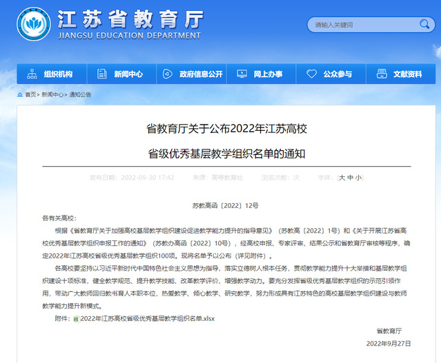 江苏高校省级优秀基层教学组织评选,是省教育厅为深入贯彻习近平新时代中国特色社会主义思想,全面落实党的十九大和十九届历次会议精神,全面深化教育教学改革,大力加强高校基层教学组织建设,提高本科人才培养质量,推动江苏高等教育高质量发展所开展的专项工作。