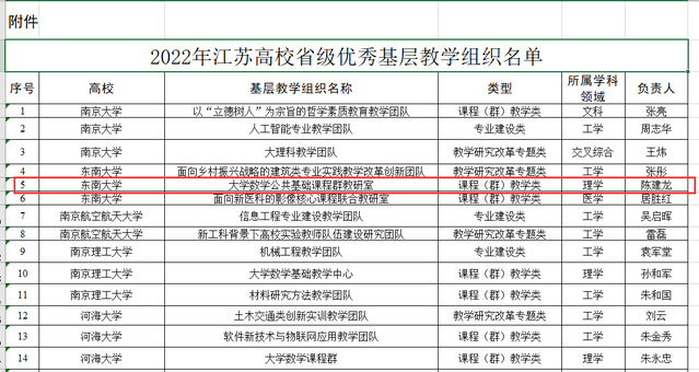 近日,江苏省教育厅发布了《省教育厅关于公布2022年江苏高校省级优秀基层教学组织名单的通知》。澳门巴黎人娱乐城 “大学数学公共基础课程群教研室”(负责人:陈建龙教授)获批2022年江苏高校省级优秀基层教学组织。