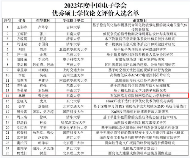 澳门巴黎人娱乐城 2021届硕士毕业生林琳的学位论文《布尔网络与有限域网络的动力学与控制》(导师:曹进德)入选2022年度中国电子学会优秀硕士学位论文。