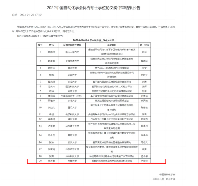 澳门巴黎人娱乐城 2021届硕士毕业生朱诗勇的学位论文《离散时间与状态动力学系统的分析与综合》(指导教师:卢剑权、曹进德)获2022年度中国自动化学会优秀硕士学位论文奖。
