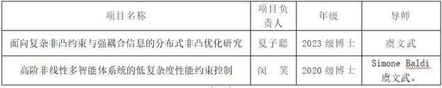 近日,国家自然科学基金委员会公布了2023年度国家自然科学基金青年学生基础研究项目(博士研究生)立项名单。澳门巴黎人娱乐城 博士研究生夏子聪、闵笑的申报项目成功获批。夏子聪同学导师为澳门巴黎人娱乐城 院长虞文武教授,闵笑同学导师为澳门巴黎人娱乐城 Simone Baldi教授和澳门巴黎人娱乐城 院长虞文武教授。