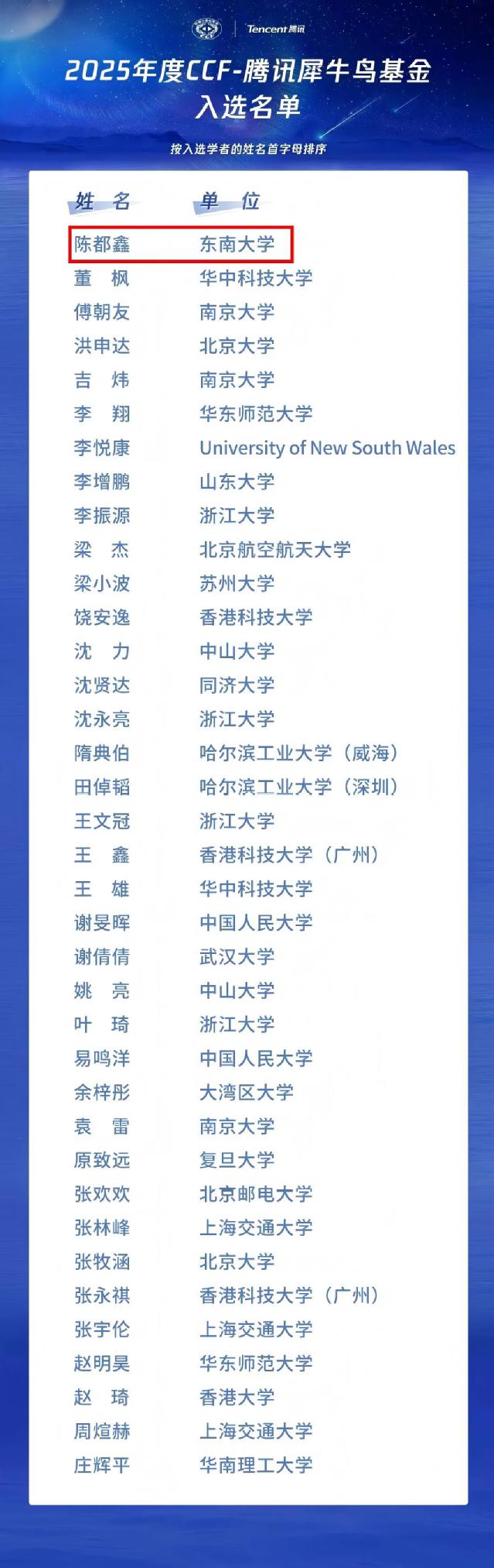 7月31日,2025年度CCF-腾讯犀牛鸟基金(以下简称“犀牛鸟基金”)入选名单公布,澳门巴黎人娱乐城 陈都鑫副教授成功入选。2025年度犀牛鸟基金共收到来自130余所高校的390余份高质量申请,项目组特邀50余位学术界及腾讯技术专家组成评审委员会,基于科研能力、研究价值、学术创新性及方案可行性等维度进行评估,经过多轮严格评审,最终遴选出37位优秀学者。