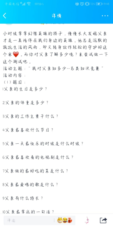 心理健康服务部于2020年6月15日至2020年6月19日举办 “我对父亲知多少——另类知识竞赛”活动。感恩父亲,通过另类的知识竞赛让同学们明白自己对父亲是否真正了解,更好表达对父亲的关心与爱。