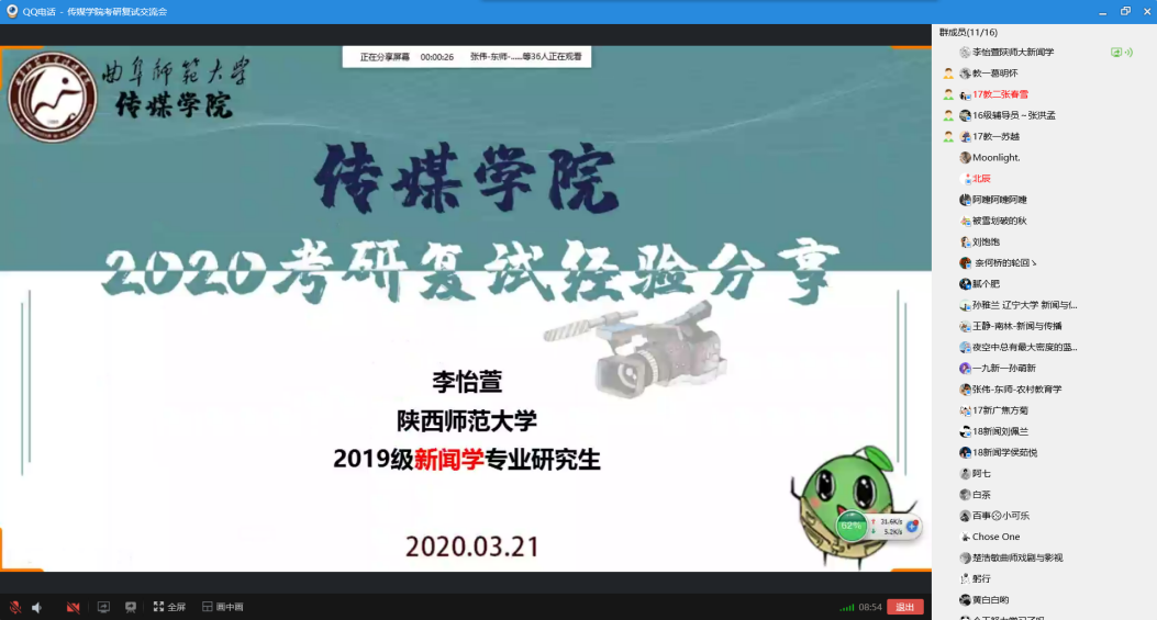 信息的各种方式以及论文的架构和写法,并推荐了相关优质公众号、书籍和APP。分享会最后,张洪孟老师做出总结,对5位已经毕业的传媒优秀学子表示感谢,并鼓励大家向优秀毕业生学习,积极备战2020年考研复试。会后,张洪孟老师还同优秀毕业生们讨论了当下居家学习的情况以及网课的优缺点,师哥师姐们踊跃发言,分析了线上教学的利与弊,并根据实际情况就如何调动师生互动积极性等教学方面的问题提出了自己的看法和见解。