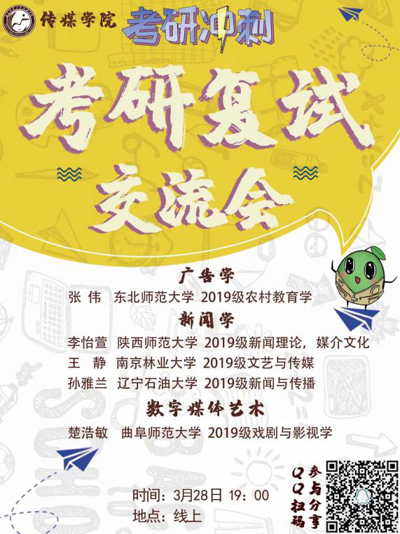 举办2020年广告学、新闻学、数字媒体与艺术学专业考研复试经验线上分享会。本次分享会邀请到了东北师范大学2019级农村教育学研究生张伟、陕西师范大学2019级新闻理论、媒介文化专业研究生李怡萱、南京林业大学2019级文艺与传媒专业研究生王静、辽宁大学2019级新闻与传播学研究生孙雅兰、澳门巴黎人娱乐城