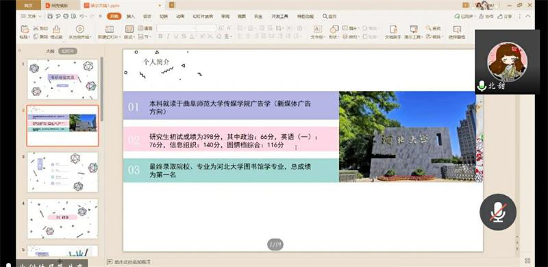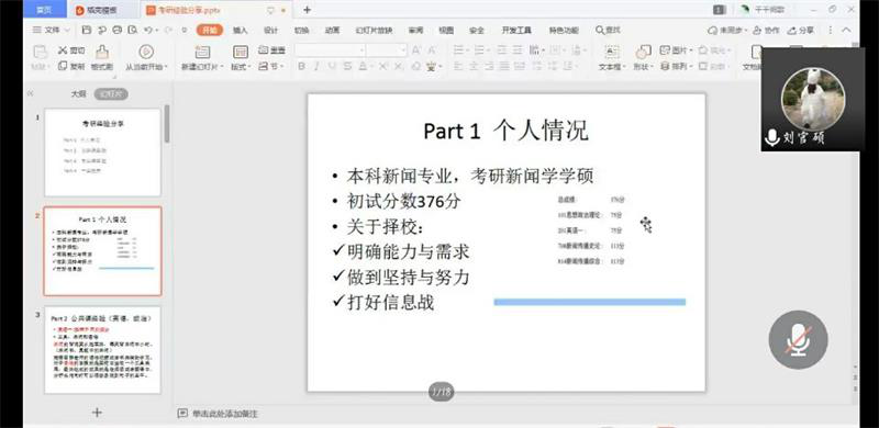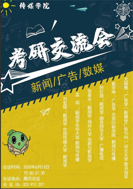 于线上组织开展了新闻、广告、数媒专业的考研交流会,邀请了优秀考研学子分享考研经验。2016级新闻学专业的刘官硕、孟瑶、张泉水、孙红艳,2016级广告学专业崔宇坤、新媒体广告专业尤丽雅担任本次交流会的主讲人,2017级、2018级相关专业学生参加本次交流会。