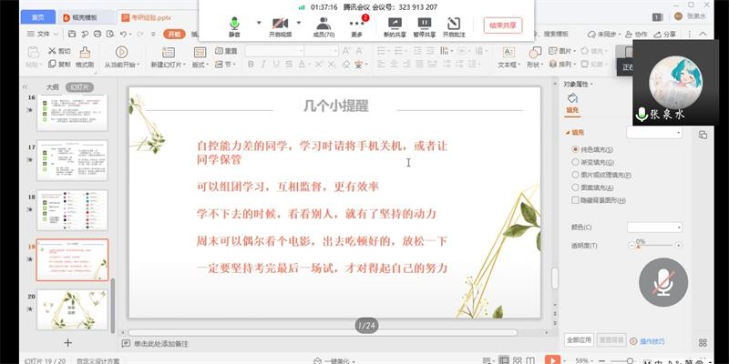 基本概况、复习方法两个方面介绍了自身考研历程,分享了专业课及公共课方面优秀的考研公众号,并对考研中后期的时间规划、心理建设提出了个人建议。尤丽雅主要从政治、英语、专业课、备考建议四个方面介绍自身考研经验,并分享了联想记忆、倍速听网课等复习技巧。交流会最后,主讲人就同学们提出的疑问进行了解答。
