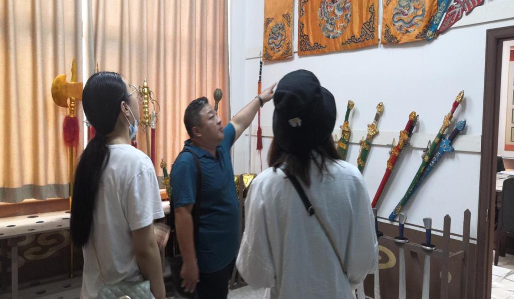 随后,在剧院院长的带领下,队员们参观了茂腔展厅。在乐器展厅里,队员们看到了茂腔演出时需要的鼓、锣、唢呐、笙、低胡、扬琴等乐器,不仅了解了其各自负责的音域、音调与音色,还得知了茂腔演奏中必不可少的灵魂乐器是京胡、阮和月琴。在道具服饰展厅里,队员们见到了演出中使用的刀、枪、剑、匕首、火把等道具,还见到了白袍、黄袍、发冠等制作精美的服装发饰。在茂腔的演出过程中,巧妙运用的道具、精巧搭配的服饰是演出生动活力的重要影响因素。