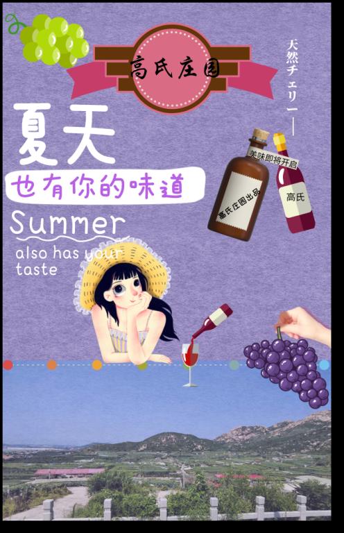 制作过程中,实践团队用淡紫色渲染海报背景的底色,色调雅致,旨在突出对高氏企业生态旅游方面的宣传。海报的正上方设有“高氏庄园”的品牌logo,勋章的选择也更显瑰丽与大气。品牌下方设有“夏天,也有你的味道”的中英文字样,作为宣传标语,既有“欢迎消费者光临采摘品尝”的意味,同时又表达了了高氏葡萄酒陈酿味浓、品后留香的特点。此外,在海报中央还穿插设置了人物、葡萄酒、玻璃杯等素材,与国际知名葡萄酒品牌作比,旨在推进高氏品牌的潮流化与国际化,做大做强高氏企业。在背景的连接处还设有紫绿相间的葡萄,表示高氏企业在葡萄采摘与销售等领域的拓展。企业通过签约合作社等方式延长产业链,拓宽产品销路,扩大销售市场,并向着创新、私人订制的企业目标不断发展。