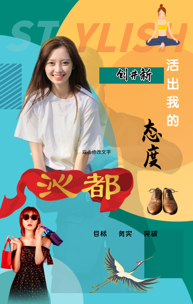 着眼于企业这一目标诉求,“知行合一”实践团队在海报设计上重点突出企业的“新”亮点。海报以蓝、橙、绿为主题背景色,并以混搭的元素突出服装企业活力与潮流的目标特点,带给受众与广大消费群体鲜明、欢快的印象体验,更加吸引现代年轻人群注意力。在海报素材的选择上,更加突出元素的“多元化”,更加注重体现“时尚、舒适、整洁”并存的服装制作风格,将涉及对象扩展至追求自由的青年学生、潮流高端的时尚人士和精英职场领域的企业人士等众多消费人群,帮助取得更好的宣传效果。此外,海报中“仙鹤”“英式皮靴”等元素的设置,体现了沁都复装有限公司“传统与现代并存”的创作理念以及对于经典与品质的不懈追求。最后,经队员们的讨论,决定将“活出我的态度”定为企业的宣传标语,旨在突出沁都对于服装以及给予消费者优质服务的初心和态度,企业的品牌以红色丝绸为底衬,代表着柔顺丝滑的服装品质与高端的品牌口碑,凸显沁都服装企业的国内和国际地位。