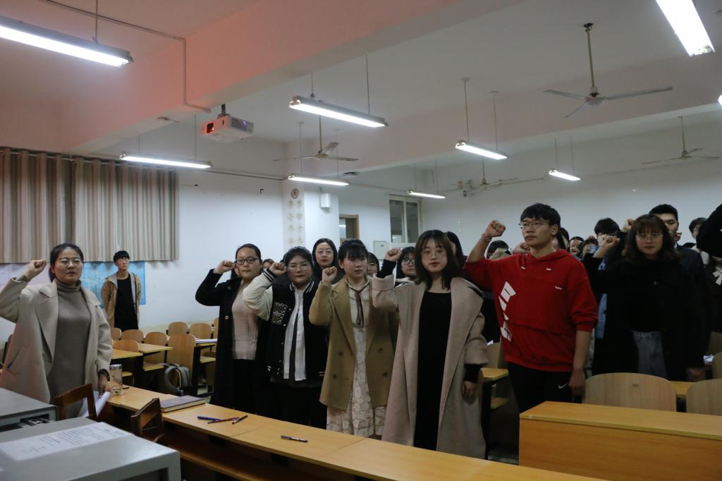 会议伊始,魏义倩等24名入党申请人依次宣读入党志愿书,并对自己的个人履历、入党动机等情况向党支部做出了汇报,表达了加入中国共产党的信心与决心。同时入党介绍人逐一介绍了申请人的相关情况,表达自己的介绍意见。随后,组织委宣读申请人的综合政审。最终经过正式党员无记名投票表决,一致同意接收李玉莹等24名同志为中国共产党预备党员。随后,各预备党员在商秀英的带领下,面向中国共产党党旗庄严宣誓。同学们情绪高涨、声音洪亮,将会议气氛推向高潮。