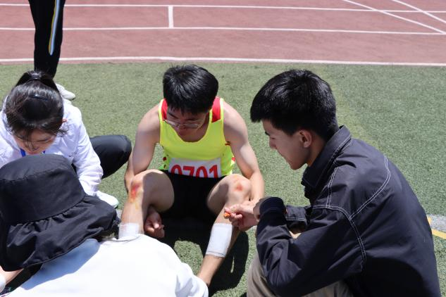 师生组成的后勤队伍的身影。每当运动员受伤时,他们总会在第一时间为伤员处理伤口,尽职尽责,每一次的问候与守护都凝聚成了运动员坚强的后盾。