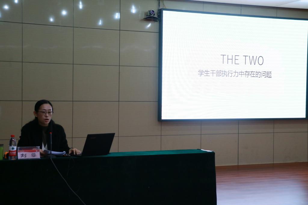 刘蓉老师为学生干部作了题为“如何提升学生干部的执行力”的报告。刘老师讲述了先前自己当干事的亲身经历,与同学们建立联系、拉进距离,引出了执行力的概念。接着,她指出了学生干部的执行力存在的问题,并结合工作经验进行具体分析。她强调,学生要做好工作的反馈和沟通,“问题就是在沟通交流中发展并解决的”。最后,她殷切期望学生干部树立“大局意识”,身处任何岗位都要做到“传、帮、带”和“主动出击”,做到自律、明确工作目标、团结好部门,将责任制和执行力落实在实际工作中,提升自身软实力。