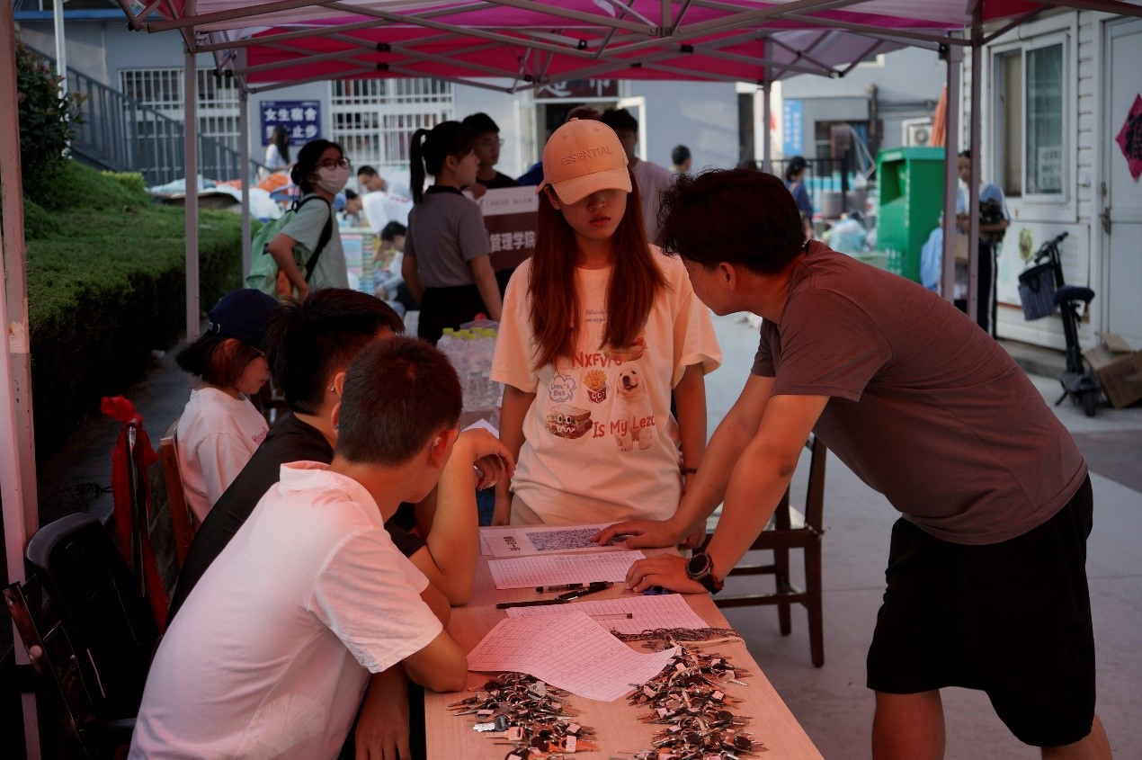 迎新工作如火如荼,迎新接待人员们早已在园区内等候,为新生发放宿舍钥匙,指导新生办理水卡,耐心询问并登记被褥订购情况以便保障届时被褥发放工作无误。