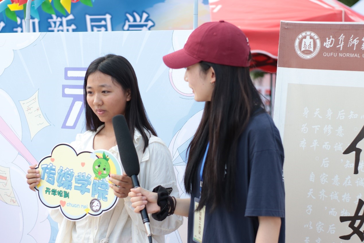 迎新志愿者发挥专业特长,举起麦克风,架起摄像机,认真聆听新生的每一句话,让新生近距离感受传媒的魅力。