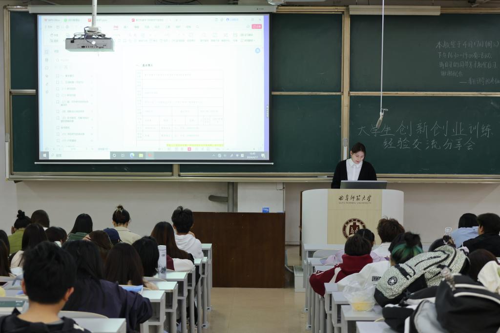 会上,刘筱青用轻松幽默的语气,从大学生创新创业大赛的申报流程、项目立项和参赛好处三个方面,向大家详细分享了大学生创新创业大赛的经验。她建议同学们把重点放到立项环节上,从自己的兴趣出发,综合考虑研究项目的学术价值应用前景,充分考量创新可行性,密切关注国家热点和国家政策。针对如何增强大创申报书的核心竞争力的问题,她结合自己参与制作的大创申报书,分析了人文社科赛道跨学科的优势,提出了许多初赛者容易遇见的疑难问题的解决方法,并向同学们推荐了国内外查询资料的网站以作参考。