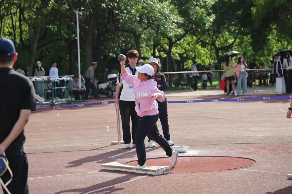 教职工紧握铅球,转体蓄势,迈出有力步伐,将铅球以弧线抛出,展现卓越实力。