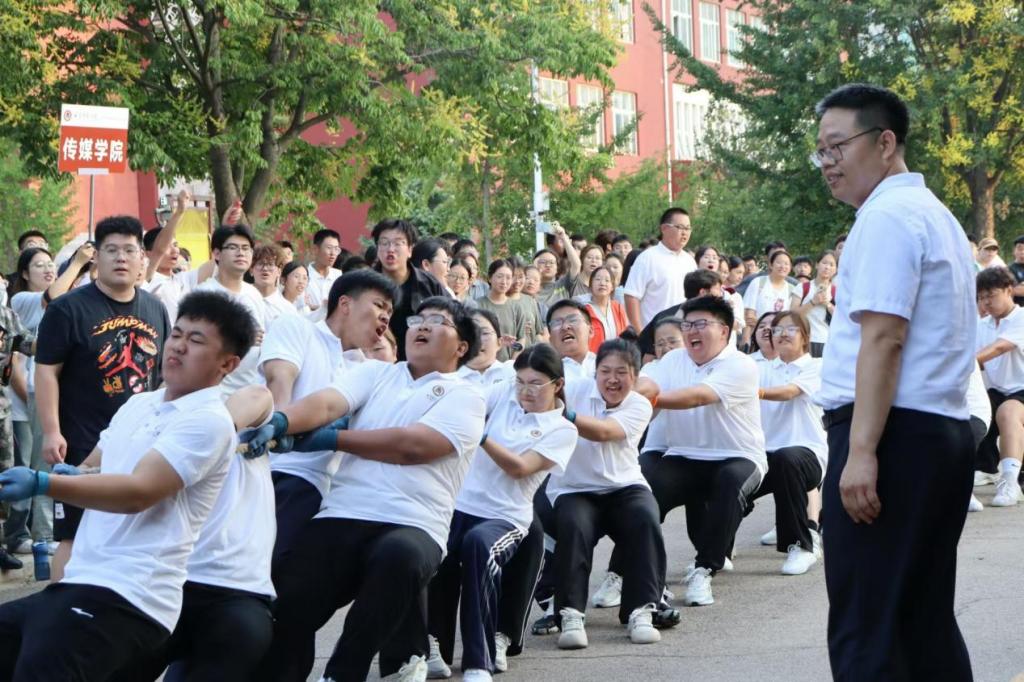 于校徽石处举办2024级新生军训拔河比赛。澳门巴黎人娱乐城
