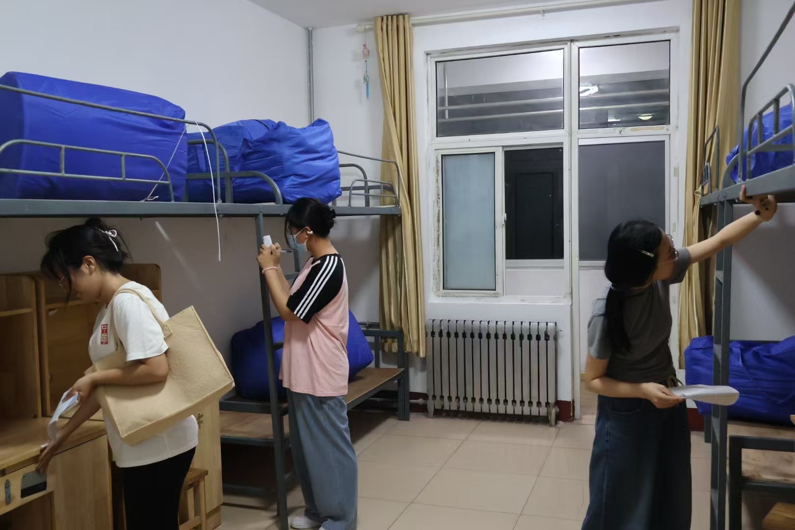 成员们分组行动,深入每一间新生宿舍,以“不放过任何细节”为原则开展排查。在卫生方面,对地面、桌面、床铺、衣柜等区域进行细致清扫与检查,确保无灰尘、无杂物;在安全方面,重点核查宿舍内线路是否规范、插座是否完好、消防设施是否齐全有效,同时检查床铺、桌椅等家具的稳固性,及时记录并整改发现的问题。此外,成员们还对仔细核对床铺、新生和被褥的对应情况并一一记录。