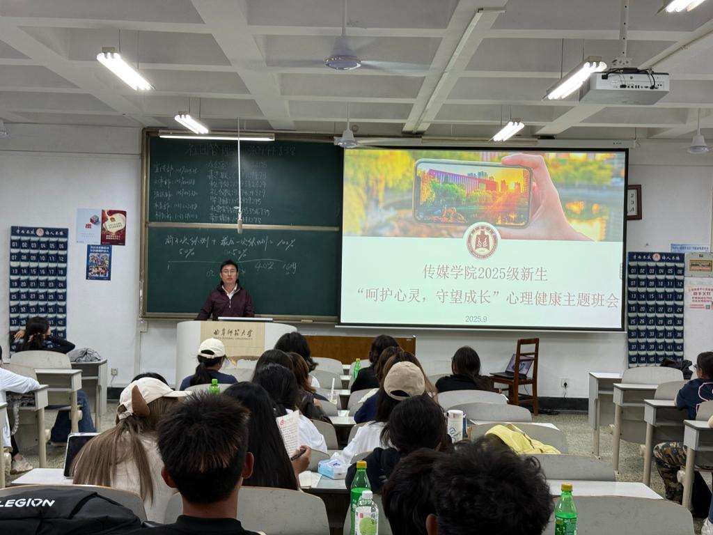 组织开展“呵护心灵,守望成长”心理健康主题班会,辅导员张洪孟担任主讲人,2025级全体新生参与。