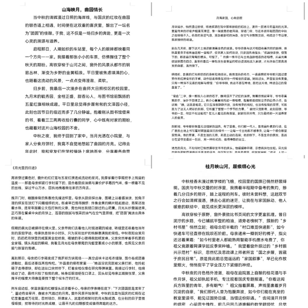 全体学生,以征文形式邀请同学们记录双节期间的经历与心理变化。活动过程中,同学们踊跃参与,以文字回溯假期里与家人共度的团圆时刻,以青春视角诠释“国之繁荣”的具象模样,用文字完成一场与内心的对话。经专业评审,宋安然、王凤媛、闫楚晗凭借双节经历的细腻书写、家国与成长的深度联结荣获一等奖,董仁雪、魏可欣、李纾伟等28名同学分获二等奖、三等奖和优秀奖。