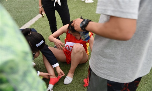 下午4:00,女子100米栏的比赛如期进行。比赛开始,王飞遥遥领先,充分展现了她的跨栏风采。在最后即将冲线的时候,王飞不幸摔倒,最终她忍着伤痛完成了本次比赛。王飞负伤时坚强的信念以及强烈的集体荣誉感打动了在场的运动员以及各位观众。“坚持不懈、奋勇力争”,她用实际行动诠释了运动员顽强拼搏的精神,这种精神值得全体运动员学习。