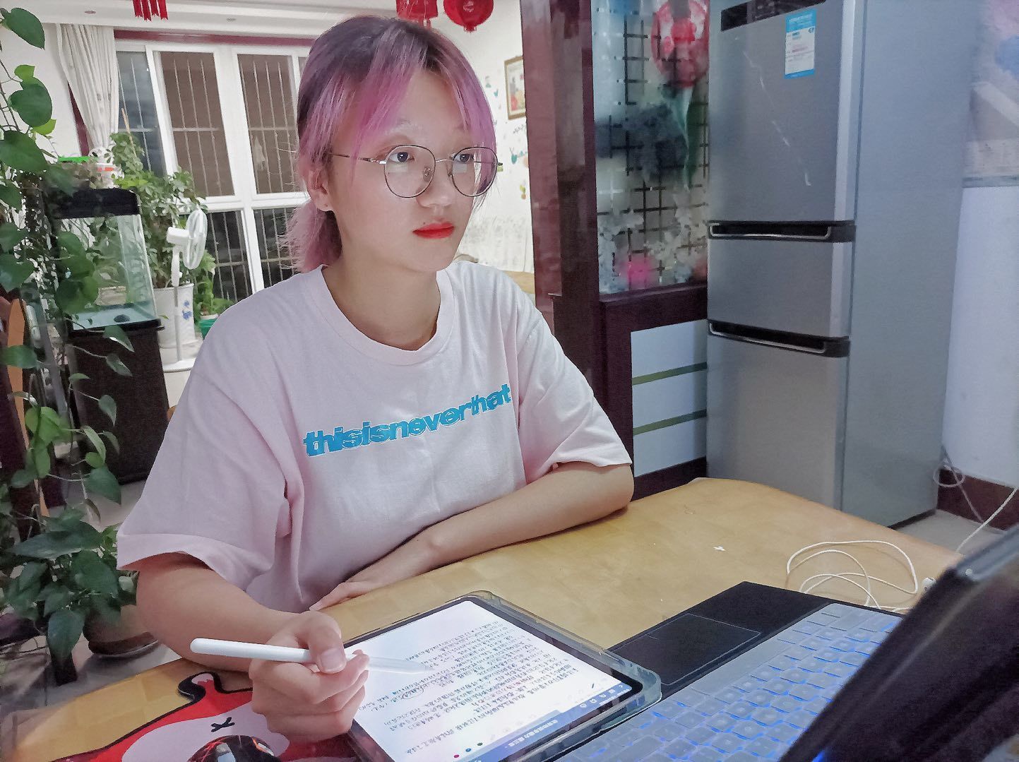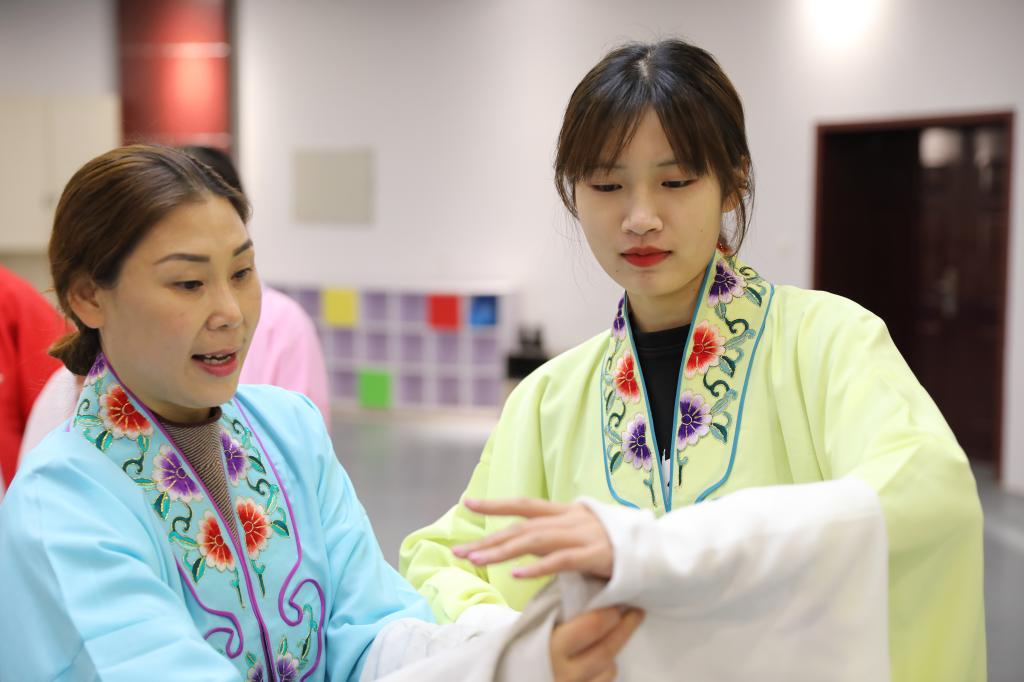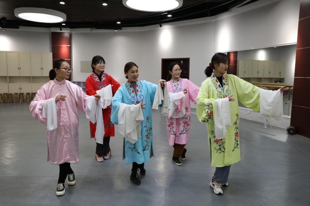 接下来,张老师邀请了她的两位学生带我们体验柳琴戏的唱腔动作,我们先观看学习了老师们的排练表演,婉转俏丽、高亢嘹亮的唱腔让我们不由地陶醉其中。在两位老师的耐心教导下,我们学习了柳琴戏的基本动作。老师一丝不苟地对待每个手势身姿的角度,并悉心地介绍每个动作的不同含义,我们细细品味着其中微妙的含义,感受到了一种欲说还休的魅力,并深深沉醉在一动一定中。我们也尝试试穿演员们的表演服装,在一丝一线里我们再次感受到了老一辈艺术家对柳琴戏传承的热忱和坚守。