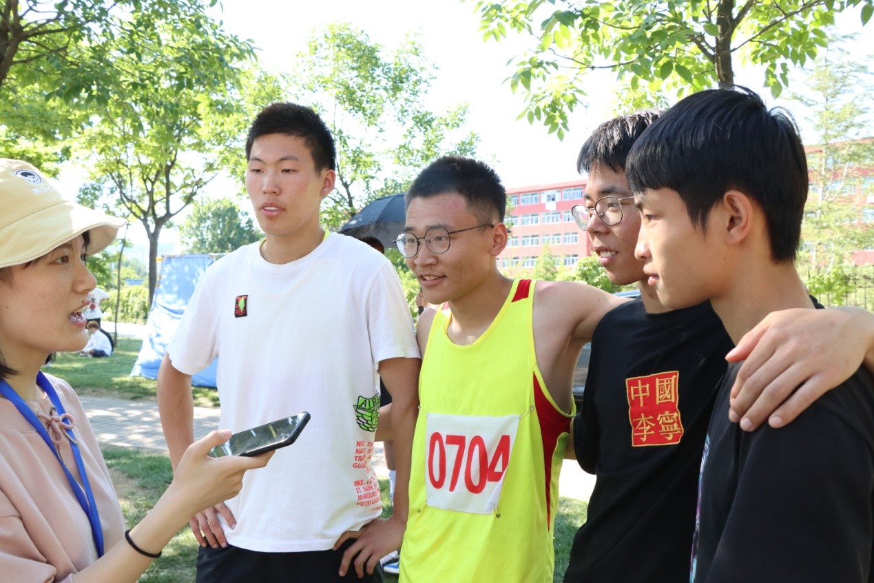 葛明怀、戴炜昂、李荣智、葛蔚在团体项目男子4*100米中取得了第二名的好成绩。在赛后采访中他们表示:“不管是两两之间的默契还是团体间的默契,都需要在不断地训练中磨练。”李荣智直言:“在比赛中我不慎摔倒了,这是我的失误也是遗憾。取得的成绩与理想还是有差距的,但不管怎么样尽力就好。”无数个日日夜夜的辛劳,才换来今天的收获。洒一把艰辛的汗水,继续抬起疲倦的脚步,不论成功与否,都要勇往直前。骄阳下,他们用汗水诠释了团结的意义。