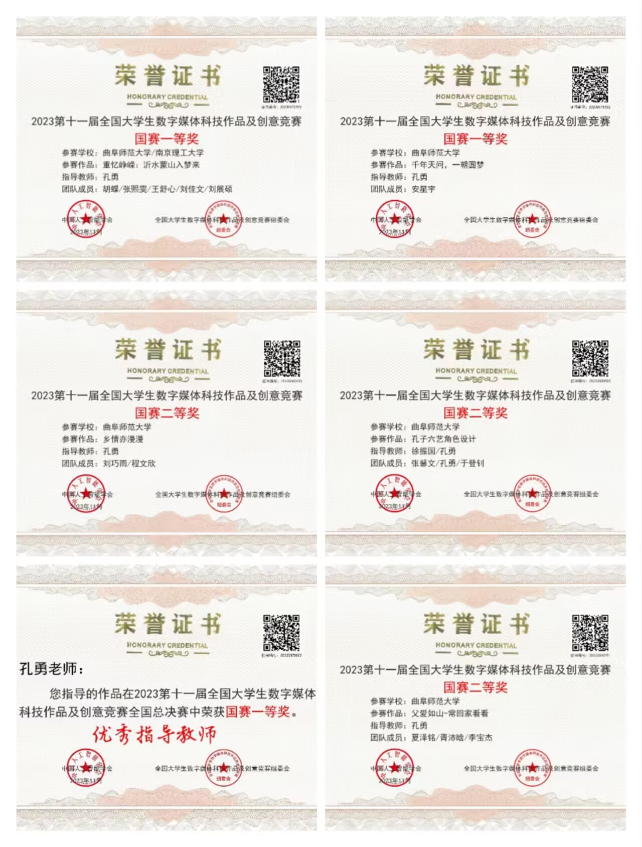 本届赛事中,传媒学子胡蝶、王舒心、刘佳文等人的游戏作品《重忆峥嵘:沂水蒙山入梦来》以“计算机+数字媒体”的学科融合为创作路径,通过游戏形式传播沂蒙红色文化,助力沂蒙精神创造性转化、创新性发展,获得国赛一等奖。传媒学子安星宇的插画作品《千年天文,一朝圆梦》以独具特色的构图与精巧绘画风格展现了小镇做题家桂海潮通过自己的奋斗与开拓,实现人生理想,完成“天问”之约的励志故事,同样获得国赛一等奖。另外,《乡情亦漫漫》、《孔子六艺角色设计》和《父爱如山——常回家看看》获得国赛二等奖。孔勇获国赛一等奖优秀指导教师荣誉称号。