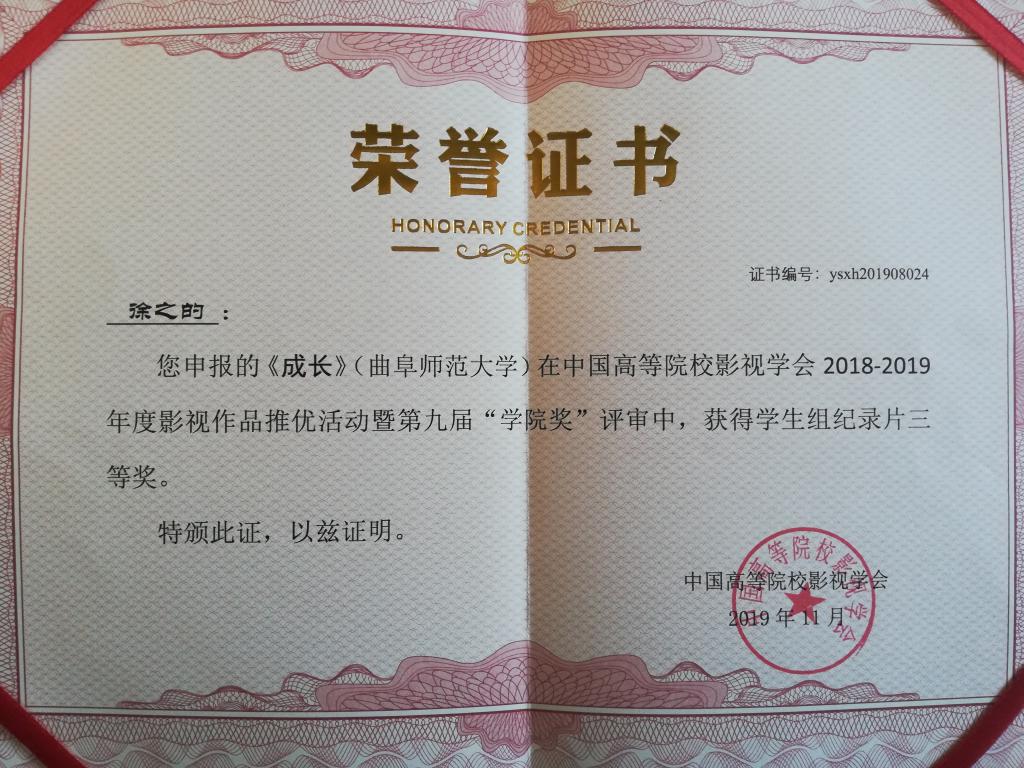 2016级新闻学专业学生徐之的及其团队创作的纪录片《成长》荣获“澳门巴黎人娱乐城