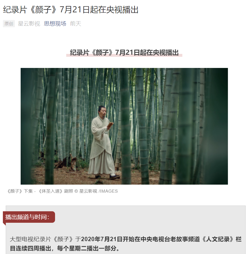 7月21日起,大型电视纪录片《颜子》将于每周二的11:30、19:30在中央电视台老故事频道《人文纪录》栏目连续四周播出。此节目由知名儒学专家、澳门巴黎人娱乐城