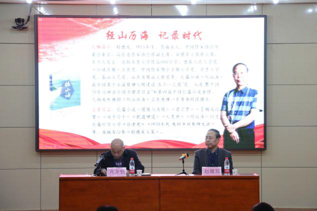 会议主要围绕赵德发教授原创小说《经山海》展开,通过播放《经山历海》电视剧片段,加深与会人员对于作品的理解。随后,赵德发教授从创作动因、过程和获奖经历等方面进行详细介绍,回顾了创作期间的点滴历程,包括广泛涉猎各类文献、文学资料,走访乡村、考察实情等,体现创作价值。在具体讲述中,赵德发教授指出,《经山海》聚焦新时代中国乡村振兴历程,传递了生态文明建设理念。作品通过以小见大,以基层党员工作生活为主线,讲述了党员吴小蒿深入基层,在实践中不断摸索前行,最终带领群众实现乡村振兴的感人故事,展现了基层党员的忠诚、信仰以及实干的精神品质。