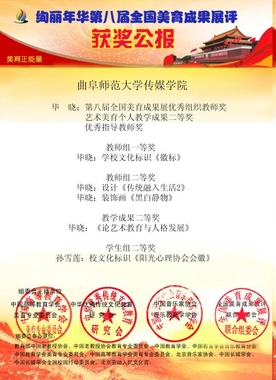 文化标识作品《徽标》荣获教师组一等奖,设计作品《传统融入生活2》、装饰画作品《黑白景物》获得教师组二等奖,论文《论艺术教育与人格发展》获得教学成果二等奖。孙雪莲同学的校文化标识作品《阳光心理协会会徽》荣获学生组二等奖。