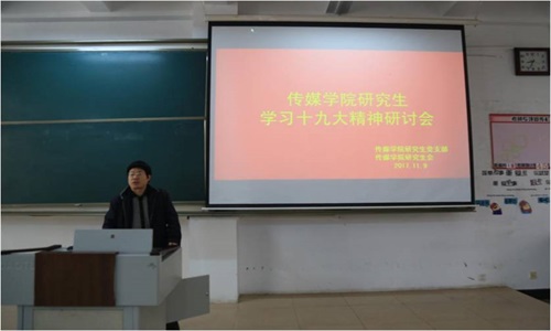 在听取讲解后,研究生们当堂展开小组讨论,畅谈学习十九大精神的体会和感受。2017级戏剧与影视专业崔菱逸同学作为学生代表,结合自己的理解,感悟要不断把学习引向深入,进一步统一思想,坚定信心,以党的十九大精神为统领,牢固树立政治意识。