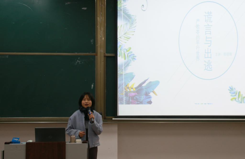 讲座伊始,陈培培以“如何走进严歌苓的世界”为切入点,讲述了自己与严歌苓作品结缘的经历。随后,陈培培带领大家品读了严歌苓的《穗子物语》节选,并简述了穗子的家庭关系。通过严歌苓相关作品的列举,她指出严歌苓之所以能在文学上取得巨大的成就,除了她具有高超的写作技巧外,还能迎合观众与批评家的需求。除此之外,她提出了“严歌苓式套路”这一观点,指出在严歌苓长达三四十年的创作过程中,艺术风貌千姿百态,“谎言”却始终没有从严歌苓的笔端退场。随后,陈培培对严歌苓进行了总评,指出严歌苓的作品更多的是一种循环,没有太多的自我突破,这也正是她天才而又局限的一面。讲座最后,王成一发表了自己的看法,他鼓励同学们要广泛的阅读,自觉接受艺术的感染和熏陶。