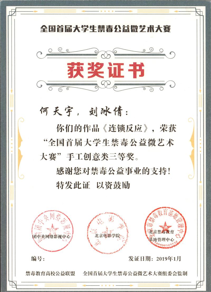 近日,全国首届大学生禁毒公益微艺术大赛获奖名单公布。我院由孔勇老师指导,数字媒体艺术专业2017级学生于甜甜创作的作品《消逝的灵魂》以及数字媒体艺术专业2017级学生何天宇、刘冰倩共同创作的《连锁反应》分别荣获手工创意类二、三等奖。