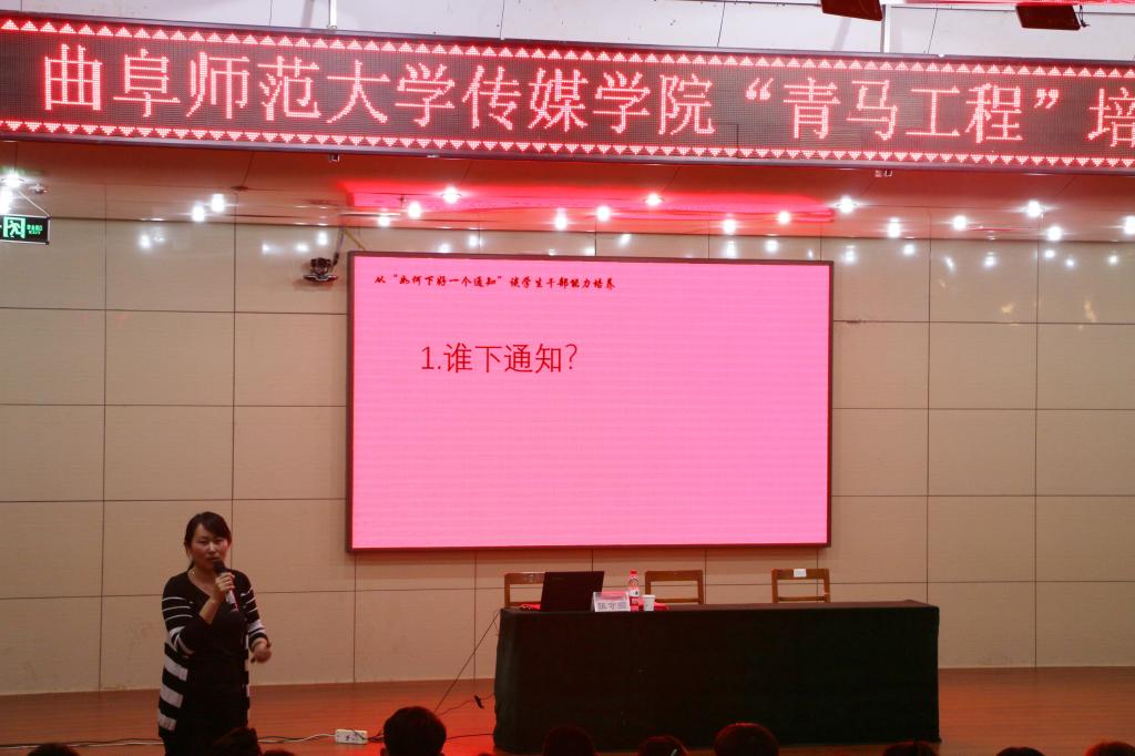 张守荣以“从如何下好一个通知谈学生干部能力培养”为主题,从“谁下通知”、“下什么通知”、“如何下好通知”、“通知的对象”、“通知的完成程度”等方面具体讲解了学生干部应如何起到上传下达作用的问题。关于“谁下通知”这个问题,张守荣讲到,每个部门具有不同的性质、不同的责任,各部门要注意角色分配,各司其职。同时,下达通知时,要根据紧急、难易、是否重要等标准将其分类,视情况而论。她还提到,学生干部要想下好通知,就要考虑如何解决通知下达中存在的问题。另外,向同学们下达通知时,应考虑同学们对通知的看法、同学们对通知下达者的看法等问题。关于下达通知的完成程度,张守荣强调学生干部要有工作的主动性和积极性。最后,张守荣就如何下好通知进行了具体讲解。学生干部充分了解并认识到了通知、及时备份通知的内容、做好PDCA环、学会充分沟通协调是下好通知的重要步骤。