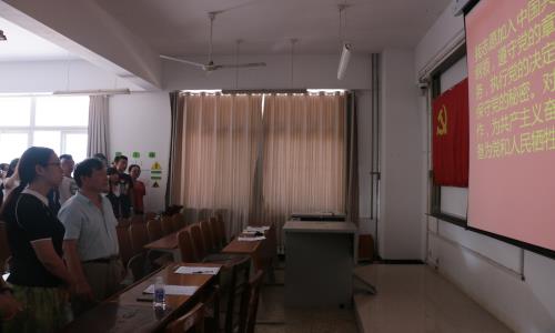 学生党支部党员全体起立,毕业生党员及其他正式党员、预备党员依次站好,重温入党誓词并进行宣誓:“我志愿加人中国共产党,拥护党的纲领,遵守党的章程,履行党员义务,执行党的决定,严守党的纪律,保守党的秘密,对党忠诚,积极工作,为共产主义奋斗终身,随时准备为党和人民牺牲一切,永不叛党。”入党誓词高度概括了党对党员的要求,也概括了党员对党组织和党的事业所承担的政治责任,并具有党规党法的性质,对每个党员都具有约束力。宣誓过程整齐划一,铿锵有力。
