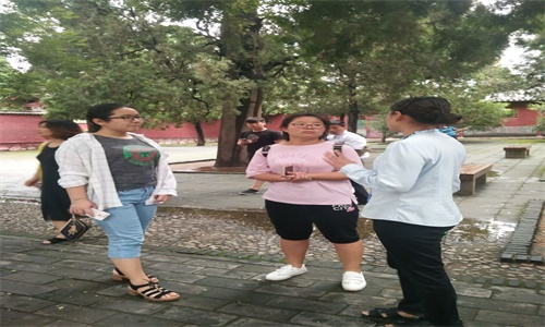 随后,队员们在景区导游的引领下了解了岱庙背后的故事。从她口中队员们得知岱庙各个门(正阳门、配天门、仁安门、厚载门)的名称皆取自孔子的思想。她告诉队员们,岱庙经历了历代的修缮,现存的众多碑刻是后人根据真迹拓印,目前众多的书法爱好者会来到岱庙购买拓印在纸上的文化产品,这也是岱庙独有的。