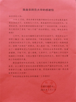 桑昌盛同学在沂源县电视台实习过程中,依托宽厚的理论知识基础,充分发挥专业优势特长,将专业所学运用到日常工作中。同时,他以踏实严谨、积极进取的工作态度主动与电视台编辑、记者交流学习,发扬吃苦耐劳的精神深入基层一线,表现出良好的协作意识和奉献精神,并写出了许多优秀作品。在短短几个月的工作中,桑昌盛同学以过硬的专业素质,踏实肯干的工作态度得到了实习单位的认可。