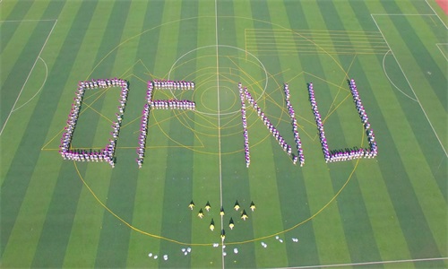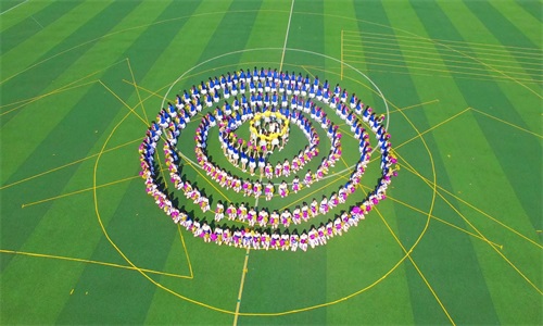 团体操队以“贪吃蛇”的形态进场,创意十足,让人眼前一亮。活力四射的舞步洋溢着青春的气息,富有内涵的队形伴随音乐节奏不断变化,从最初的两个三角形变成六芒星形。六芒星寓意着曲园学子不孜不倦、勤勉躬行的宝贵品质,彰显出曲园海韵、杏坛儒风的独特魅力。接着,队形变成了12条直线并开始跑圈,年轻的学子层层叠叠,最终围成了三层圆圈,组成太阳的形象,寓意“渊源共生,和谐共融”。随后团体操队排成的“Q、F、S、F”四个字母与“1955、2018”两组数字,代表“澳门巴黎人娱乐城