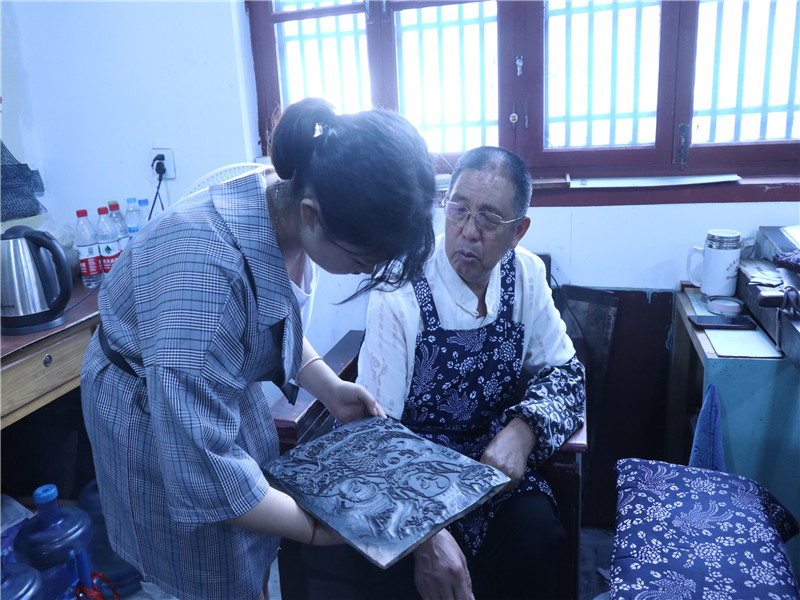 随后,我们来到木板年画制作坊现场观摩了年画的制作过程。精湛的技艺,精致的做工让队员以及游客们叹为观止。紧接着我们采访了工艺美术大师杨成俊老先生——明代著名老字号画店“长发东”的第二十代传人,自幼跟其祖父学艺,从艺五十余载。杨老先生给我们讲述了木版年画从刻板到上色的复杂程序,这让成员们感到不可思议。在与杨老先生谈到继承问题时,他十分坦诚的告诉我们,自幼学习这门技艺也是为了养家糊口,现在时代不同养家糊口的方式不同,自然就渐渐地忽略了这门技艺,传承不仅仅是杨家埠人要考虑的问题,更是社会的问题。