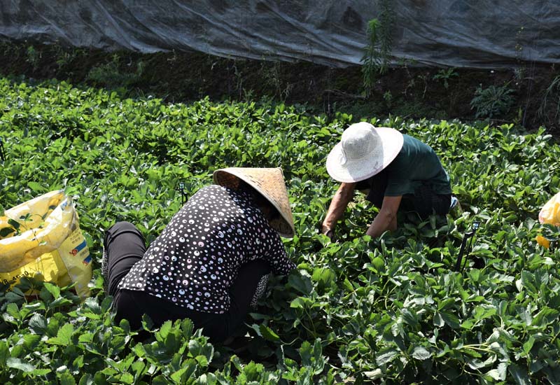 实践队员到达时,是上午的十点左右,这时被雇佣的23位工人们已经低头弯腰工作了将近四个小时。炙热的阳光透过稀疏的云彩,烤在她们的身上,但她们并没有因此而放慢了自己的工作速度。园主杨顺利介绍说此时员工们正在将草莓主茎发出的匍匐茎分开,需要一株一株的带土分离,是一项十分耗费人力的工作。员工们的工资在三千到四千元左右。在济南的其他大规模草莓种植地区,农民们都能享有国家的乡镇补贴,这是国家对于农业种植业的重视,也体现出国家希望粮食、果蔬能为人民的幸福提供保障与支持。农业是国家的根本,让农民切实在农作的过程中得到相应的回报与补贴是极其重要的。