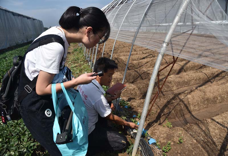 实践队成员乘车到达孙村后又步行数百米抵达草莓园,园主杨顺利热情接待,并向队员仔细的介绍种植园情况,包括土地亩数、大棚个数、草莓的习性、种植科技的应用以及员工的工作详情。在交谈中,园主杨顺利向队员们透露,自己曾经是一名农科大学的学生,因为父辈为农,家境贫苦,更希望能通过专业的农业知识给农村、农民带来福利与希望,所以放弃了在北京的工作,在自己的乡土上寻求一份归属感。在园主杨顺利和他的父亲、妻子的共同努力下,草莓种植园的生意蒸蒸日上。