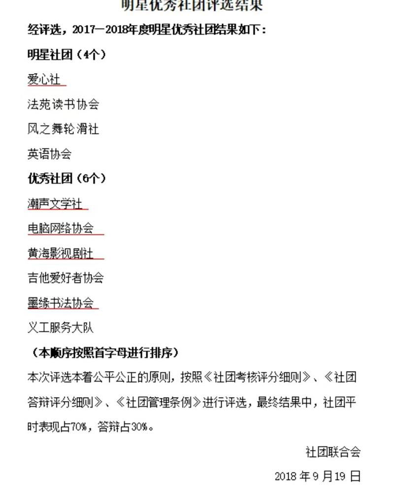 爱心社获明星社团称号;潮声文学社、电脑网络协会、黄海影视剧社、墨缘书法协会获得优秀社团称号。参加明星、优秀社团评选的各社团认真准备,通过各种不同的形式,充分展现了澳门巴黎人娱乐城