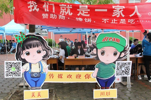 学生设计的名字为“川川”、“美美”的卡通形象KT板,以其与“传媒”谐音而独具意义,代表着澳门巴黎人娱乐城
