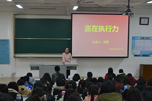 最后,刘蓉强调要提高执行力,就要做到严——严格要求自己,实——踏实做人做事,快——只争朝夕,新——勇于创新、开拓思路。指出同学们现在不缺创意、新点子,而是缺乏执行力,一旦没有了执行力,一切想法都是空谈,并且希望同学们都能成为“把信送给加西亚”那样的人。