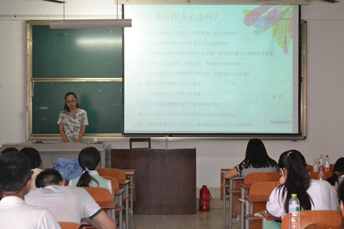 学生会工作,以迎新和军训以及各种晚会的举办为例对学生干部提升力的提升进行了深刻剖析。随后,吕文慧结合学生宿舍的管理以及各部委与宿管部的工作配合,向大家讲述了宿舍在安全、卫生、文化等方面的管理所存在的问题并对学生干部提出要求。她强调宿舍是大学生学习、生活和思想交流的“主战场”,宿舍的管理至关重要,但也存在同学不理解、不尊重不配合、自由散漫等问题。她提出,学生干部应上传下达要准确、带头遵守规章制度、带头理解、带头行动等几点要求,并对各部委对宿管工作的配合协作做出了详细说明。最后,徐俐莉以“阳光心态”为题为大家讲述了如何提高学生干部的心理素质。她以一个心理测试为切入点,提出25个问题让在座学生自我检测是否具有阳光心态。随后通过两个实验小故事与学生们展开互动,生动的阐述了什么是阳光心态、阳光心态的影响和如何塑造阳光心态。她认为作为一个学生干部必须要有一种健康、积极、乐观的心态才能更好地开展工作,要改变态度、享受过程、活在当下、积极乐观、学会感恩、充分利用各种资源,全方位塑造阳光心态。