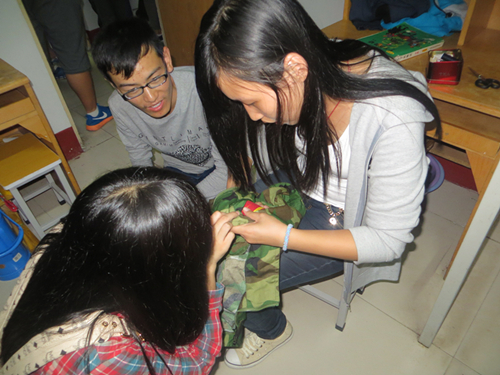 到了男生宿舍,师弟们毫不客气地蜂拥而上,把师姐们团团围住,不管是衣服上的肩章,还是衣服上的扣子,统统放心地交给师姐们处理,并在一旁耐心学习观摩。等师姐们把缝好的衣服交还给师弟们的时候,师弟们的一声声感谢也是温暖了师姐们的心。